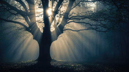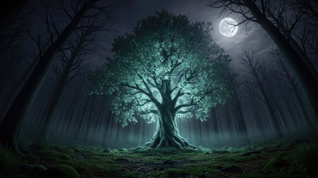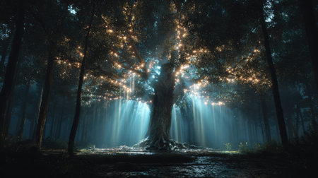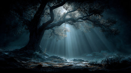 Mysterious forest scene with large tree and moonlight rays shining through branches creating magical and eerie atmosphere at night