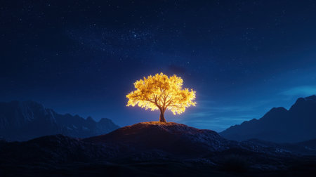 A stunning golden tree stands illuminated on a hill during the night, casting a magical glow against the starry sky and silhouetted mountains, creating a serene atmosphere.