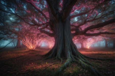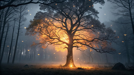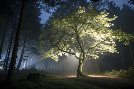 A stunning illuminated tree stands majestically in a misty forest at night, creating a serene and enchanting atmosphere. The soft light shines through the fog, enhancing the beauty of nature.