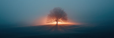 This enchanting image showcases a single tree illuminated by a soft blue light in a foggy night setting, creating a serene and magical ambiance.