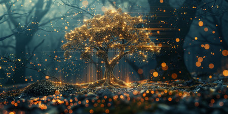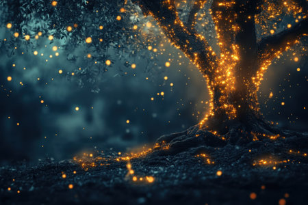 A tree with glowing lights on it. The tree is surrounded by a lot of sparkles. Scene is magical and dreamy