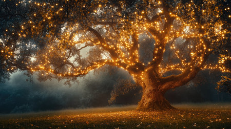 Night scene of a large tree with branches sparkling with lights, evoking a fairy-tale atmosphere in a misty setting.