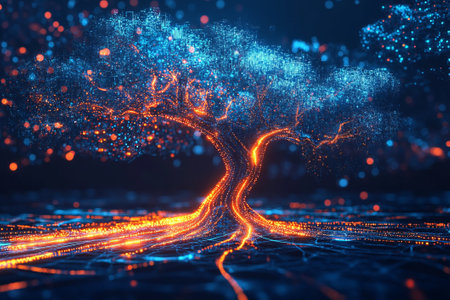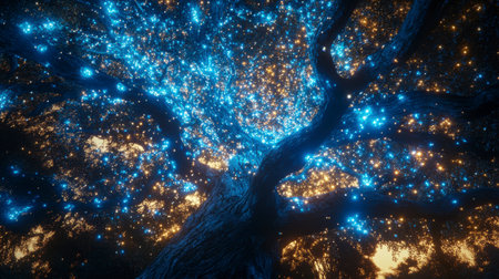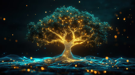 Abstract image of a tree like structure composed of glowing blue and gold particles. Dark background enhances the luminescence. Digital art with a mystical and ethereal atmosphere.