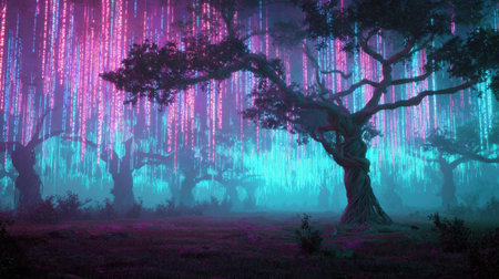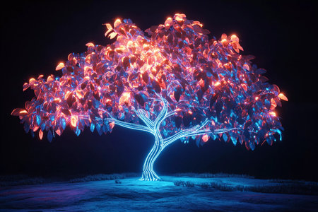 3D illustration of a beautiful fantasy tree in the garden with neon lights