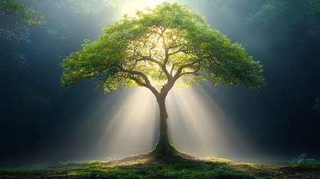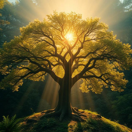 A grand tree with sunlight streaming through its branches, creating a magical atmosphere in the quiet forest.