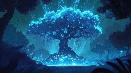 A digital painting of a large, glowing blue tree at night in a mystical forest. The scene is serene and magical.