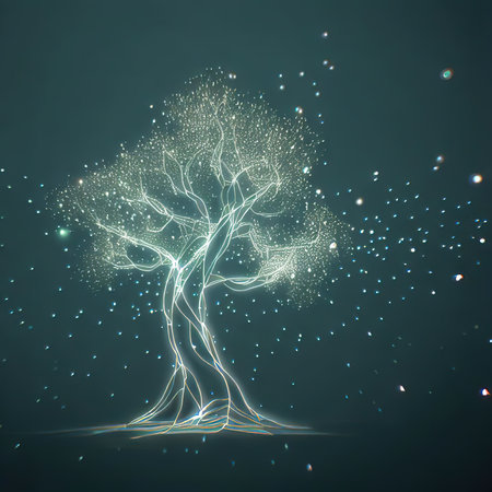 A glowing tree integrating natural and technological elements, symbolizing sustainable innovation and global connectivity