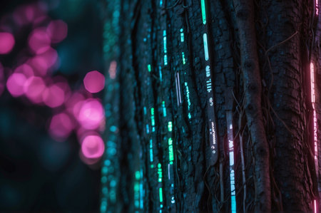 An AI generated illustration of a picturesque forest illuminated by vibrant neon colors in the night