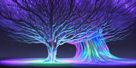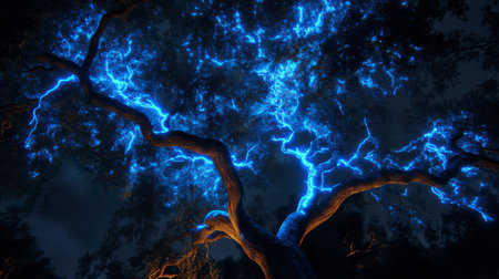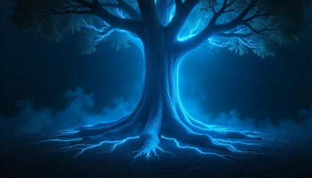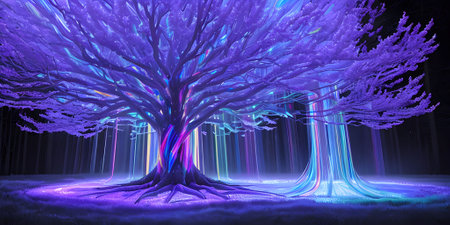 A stunning visual features a large tree illuminated with radiant blue and purple light. The image shows intricate details of branches and roots with glowing energy against a dark backdrop of a forest. It can be used for artistic purposes, illustrations, or fantasy-themed projects.