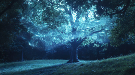 Enchanted forest scene at night. A large tree glows with ethereal blue light, its branches reaching towards a dark sky. Soft, grassy ground surrounds the tree, creating a mystical atmosphere. The image evokes a sense of wonder and tranquility.