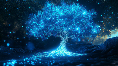 Glowing blue digital tree, pixelated particles, dark background, mystical atmosphere, digital art, abstract nature, glowing roots, bokeh effect, night scene, magical forest