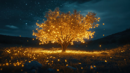 A large tree is illuminated by warm golden light, creating a magical atmosphere in a quiet meadow. Stars twinkle above, enhancing the serene beauty of the night.