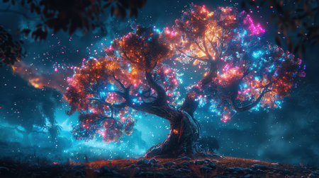 A stunning fantasy tree adorned with vibrant colorful lights illuminates a serene night landscape, creating a magical atmosphere that enchants visitors.