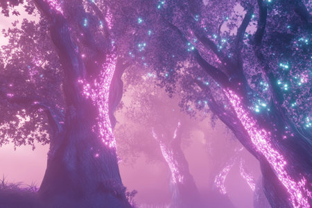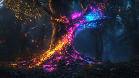 A large tree stands in a mystical forest, illuminated by swirling colors of pink and blue. The light dances around the tree, creating a magical, enchanting atmosphere at dusk.
