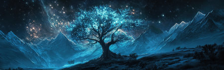 A vibrant tree emits a radiant glow against a backdrop of majestic mountains. The starry sky twinkles with brilliance, creating a dreamlike atmosphere.