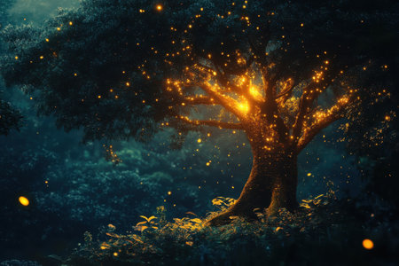 Enchanted glowing tree, mystic night forest, twinkling lights, magical allure