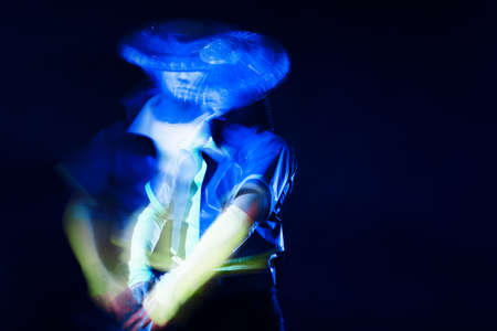 Futuristic character in a bright stylized outfit, photo with neon colors. A fantastic character, a cyber mercenary, long exposure photo with blur effect