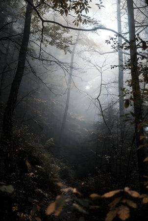 Dark forest in autumn fog