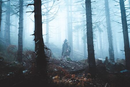 Man got lost in a spooky foggy forest among tall trees