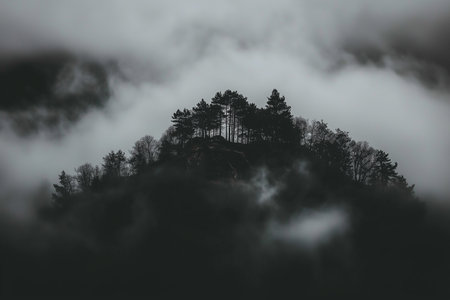 This captivating fir forest landscape showcases a hilltop enveloped in mist, with silhouetted trees emerging from the fog, creating an atmosphere of mystery and tranquility.