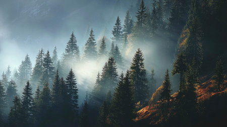 A captivating view of a fog-covered forest, featuring tall evergreen trees shrouded in mist. This atmospheric landscape evokes a sense of calm, mystery, and tranquility.