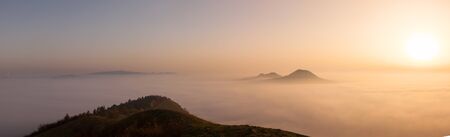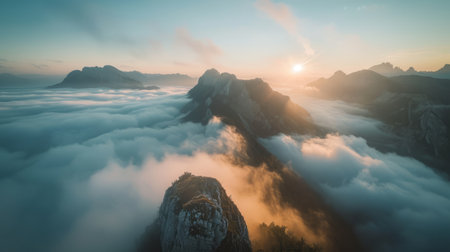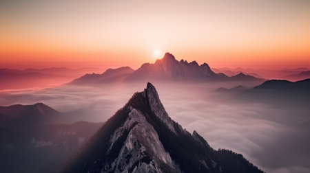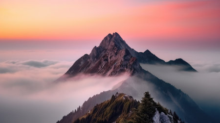 Aerial view of a mountain covered in fog under the beautiful pink sky. Generative AI AIG21.