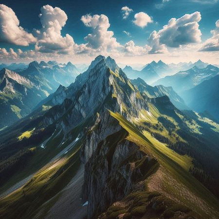 Aerial view of Swiss Alps mountain range in summer, Switzerland.
