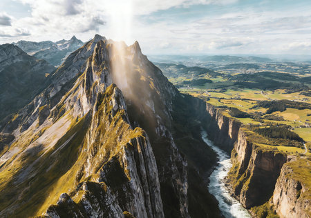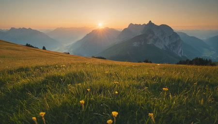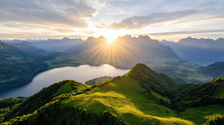 A Breathtaking Swiss landscape with mountains, lake, and sunset rays