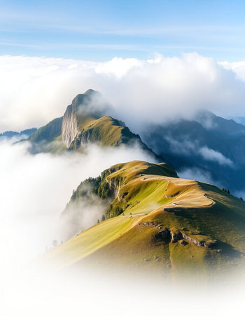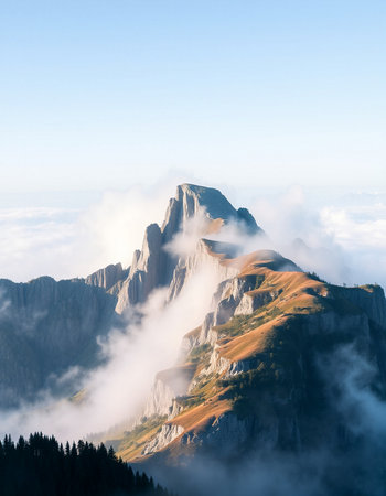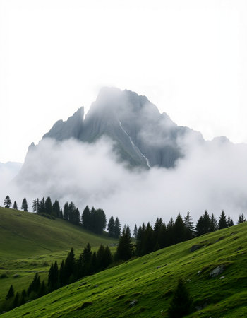 A stunning view of a solitary mountain peak enveloped in mist and fog. The serene landscape embodies tranquility, making it perfect for nature enthusiasts and wanderers.
