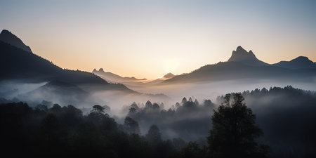 dence fog above the Mountain Forest against a big mountain range in the morning at sunrise, generative AI
