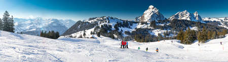 Beautiful winter landscape. People skiing in Mythenregion ski resort, Ibergeregg, Switzerland, Europe