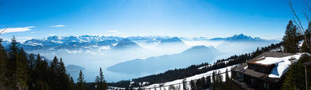 Majestic unique misty blue alpine skyline aerial view panorama of iced Swiss Alps Mount Pilatus blue sky. Mount Rigi Switzerland.