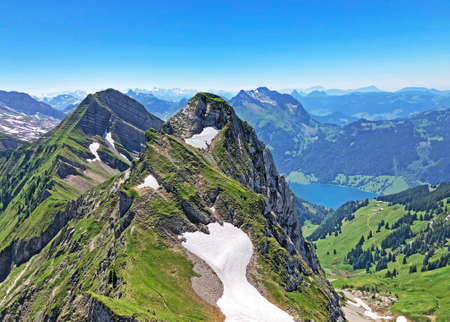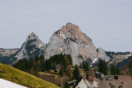 Scenic view of Mount Mythen (Gross and Klein) in spring viewed from Stoos, Canton Schwyz, Switzerland.