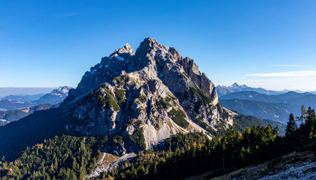 Bird's-eye view of an alpine mountain with a large expanse of blue sky, perfect for a headline