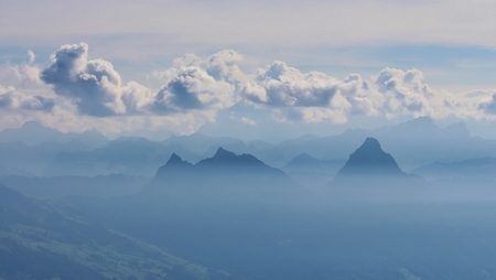 Mountain landscape with fog and clouds in the Swiss Alps, Switzerland