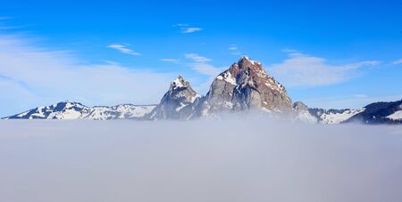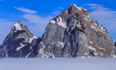 Summits of Kleiner Mythen and Grosser Mythen mountains rising from sea of fog, wintertime view from the village of Stoos in the Swiss Canton of Schwyz.