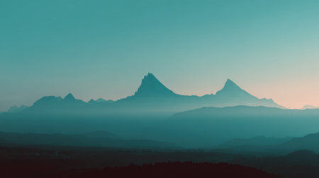 This stunning mountain landscape captures the essence of tranquility at dusk, featuring layered peaks and soft hues that create a serene outdoor atmosphere.