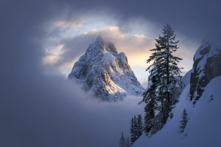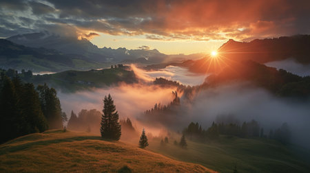 Beauftiful majestic sunrise in the Swiss Alps covered in clouds.