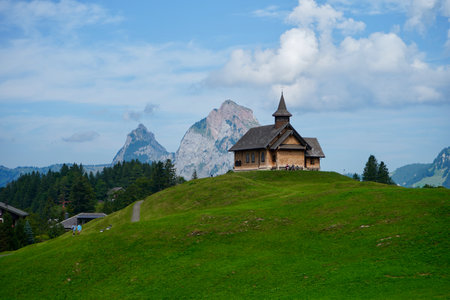 A view of a small chapel in front of a Kleiner Mythen mountain in Muotathal, Switzerland
