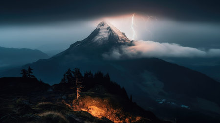 An AI generated illustration of a breathtaking view of a lightning storm illuminating the skyline of a towering mountain