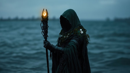 A person is holding a staff and standing in the water. The water is dark blue and the sky is cloudy. The person is wearing a green cloak and has a hood over their head. The scene has a mysterious