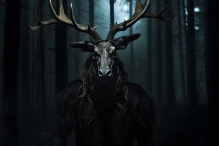 A eery devil figure from the netherworld glows in foggy moonlight.