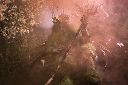 fantasy battle barbarian warriors silhouette in mountains highland hills in smoke on vivid colorful sunset light with orange pink sun glare and phantom blue sky background, toy shop concept picture