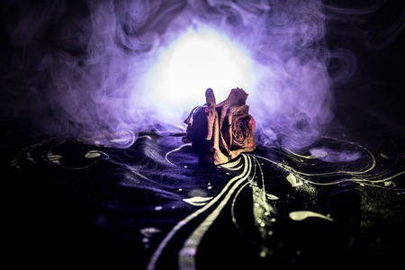 bloodthirsty zombies attacking concept. Silhouette of scary zombie walking in the dead forest at night. Creative table decorations. Selective focus