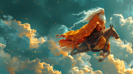 This is an illustration for children showing an old kind magician riding on a wooden horse chair. This is a realistic fantastic cartoon style story / scene / wallpaper / background / card design.