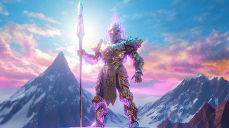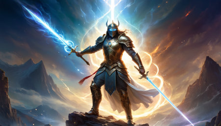 A valiant knight in ornate armor holds aloft a glowing sword, standing on a rock, exuding power against a cosmic backdrop.. AI Generation