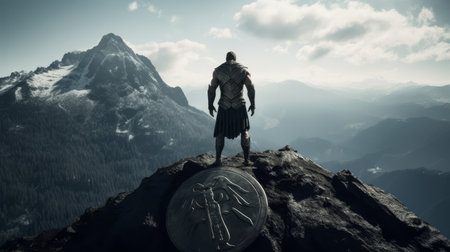 Spartan warrior atop shield-shaped mountain lambda symbol etched symbolizes strength