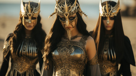 A glamorous troupe of ladies, adorned in golden and ebony attire, don striking masks as they revel in an enchanting masquerade amidst the outdoor splendor