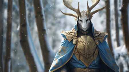 an ogre with antlers stands majestically beside a group of trees, creating a captivating scene in light indigo and gold. this epic portraiture showcases the intricate details of the ogre's stylish costume design. the snow-covered surroundings add a touch of enchantment to this close-up shot. perfect for fans of furaffinity and those who appreciate the power and beauty of nature. ai generated
