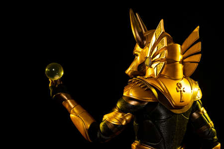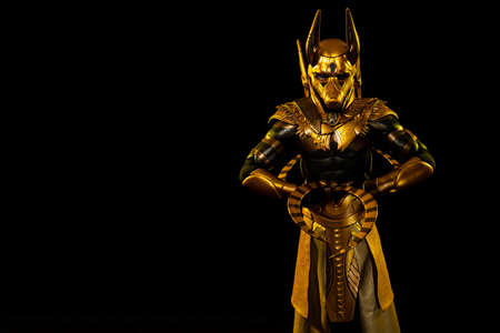 a male actor in a suit of an Egyptian mythology character, the golden deity Jackal Anubis, twists buugeng in yellow light on a black background